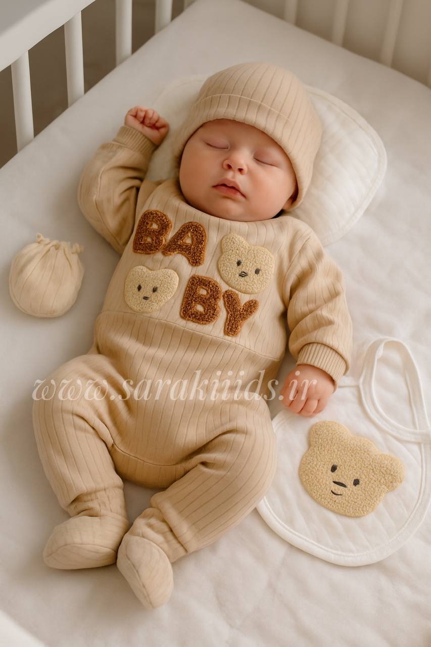 شامل:دورپیچ نوزادی-سرهمی-پیشیند-کلاه-پاپوش-دستکش-آویز لباس
