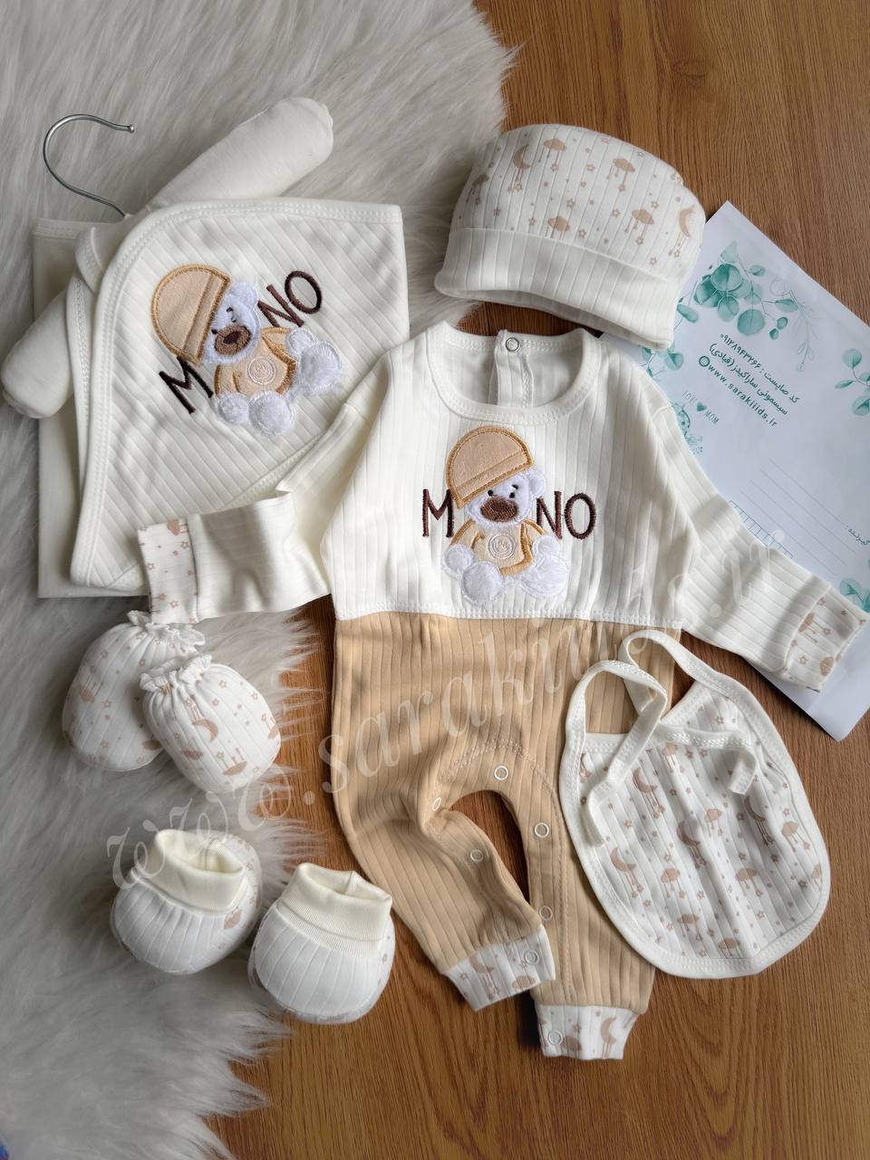 شامل:دورپیچ نوزادی-سرهمی-پیشیند-کلاه-پاپوش-دستکش-آویز لباس