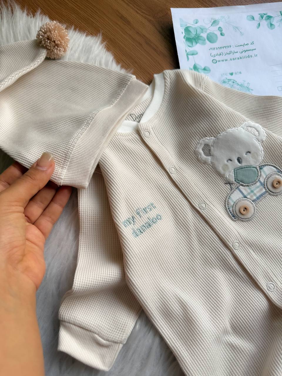 طرح گلدوزی شیک: گلدوزی ظریف و برجسته خرس بامزه سوار بر ماشین چهارخانه در سینه و نوشته “My First Danaloo” در کناره، جلوهای خاص به لباس بخشیده است.