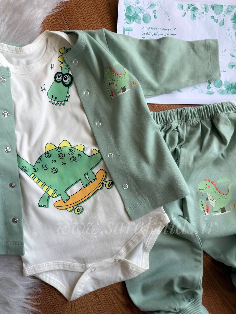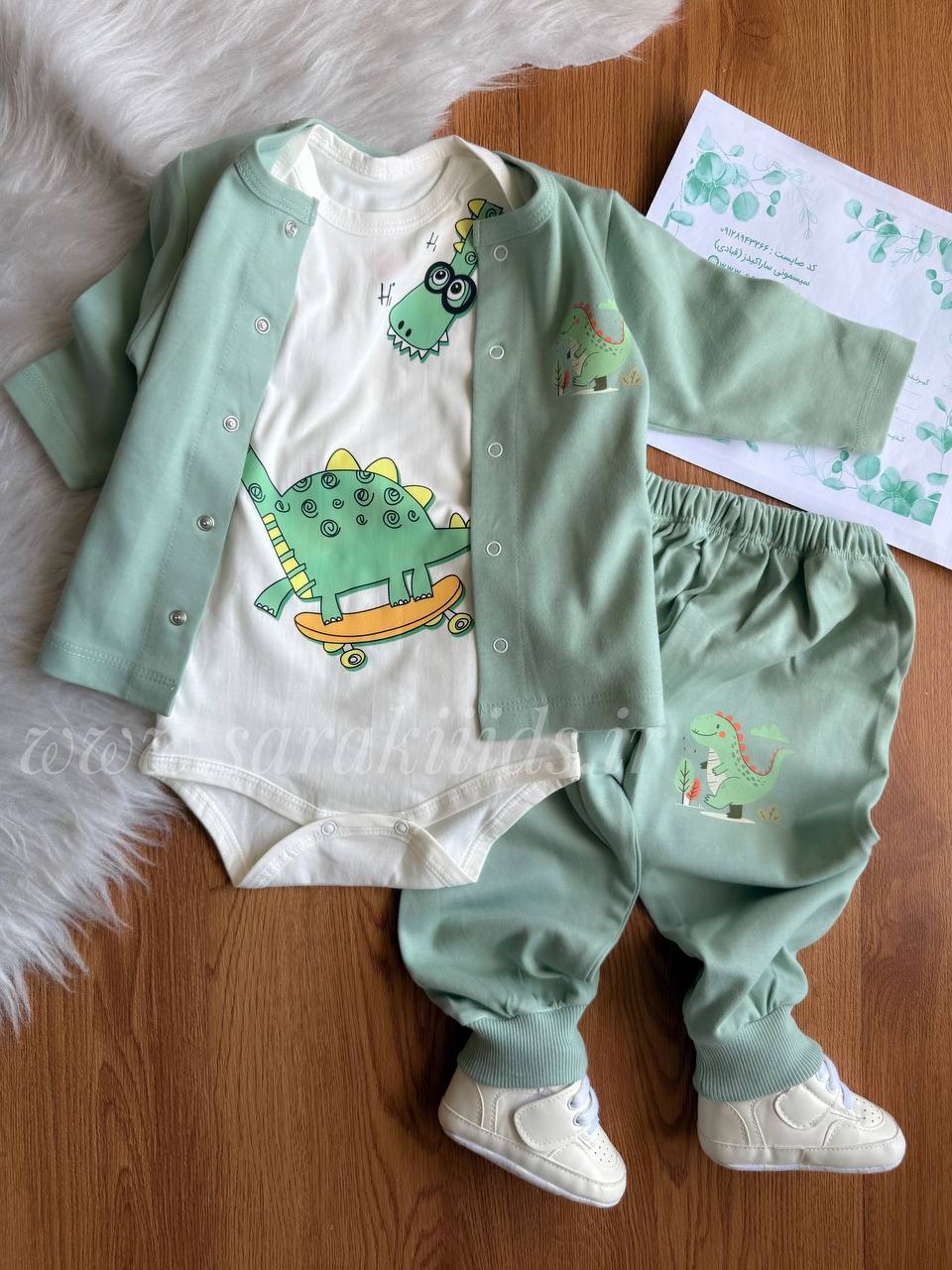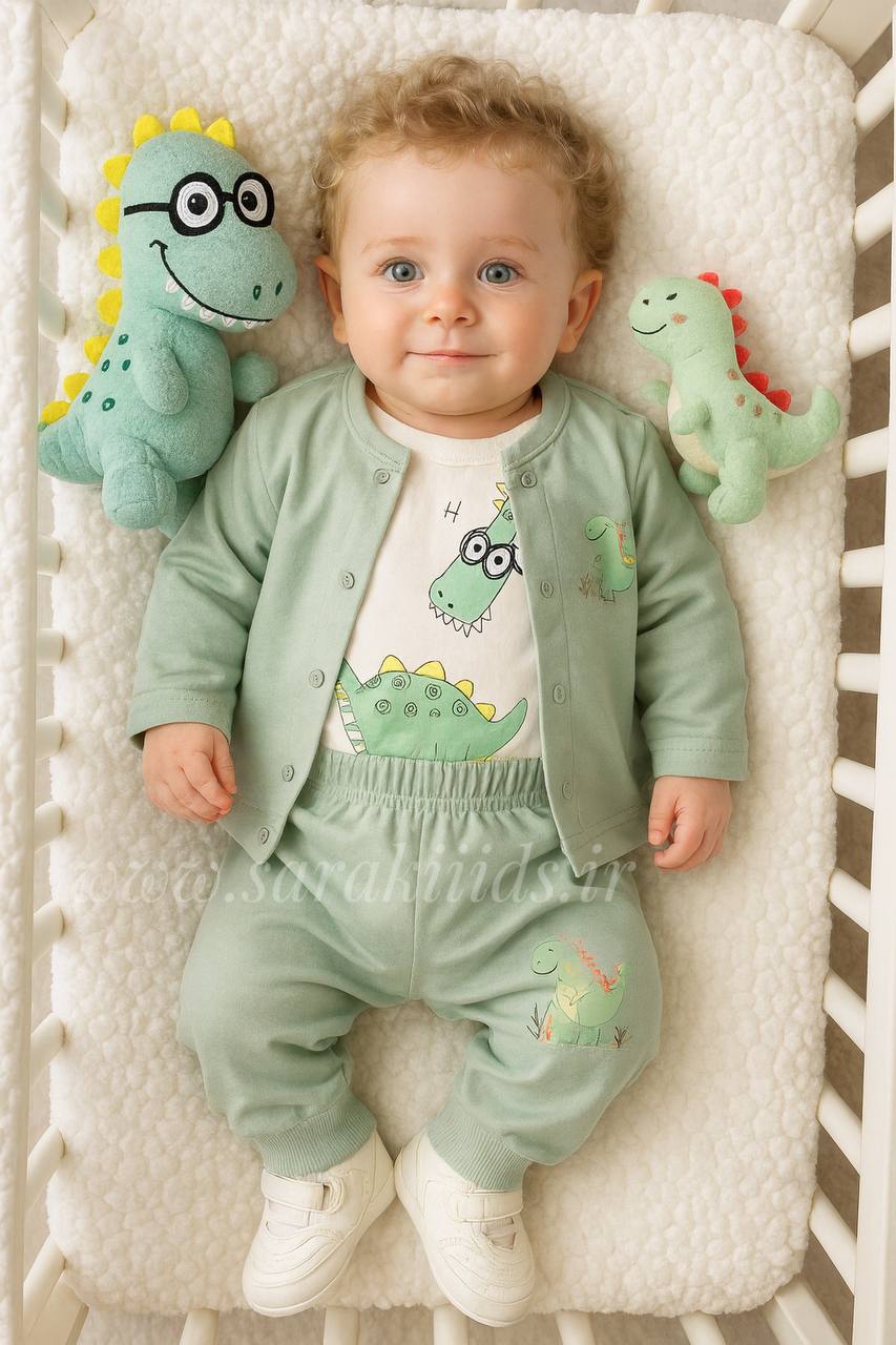 سه تکه نخ پنبه اسپرت 🥳طرح دایناسور سبز