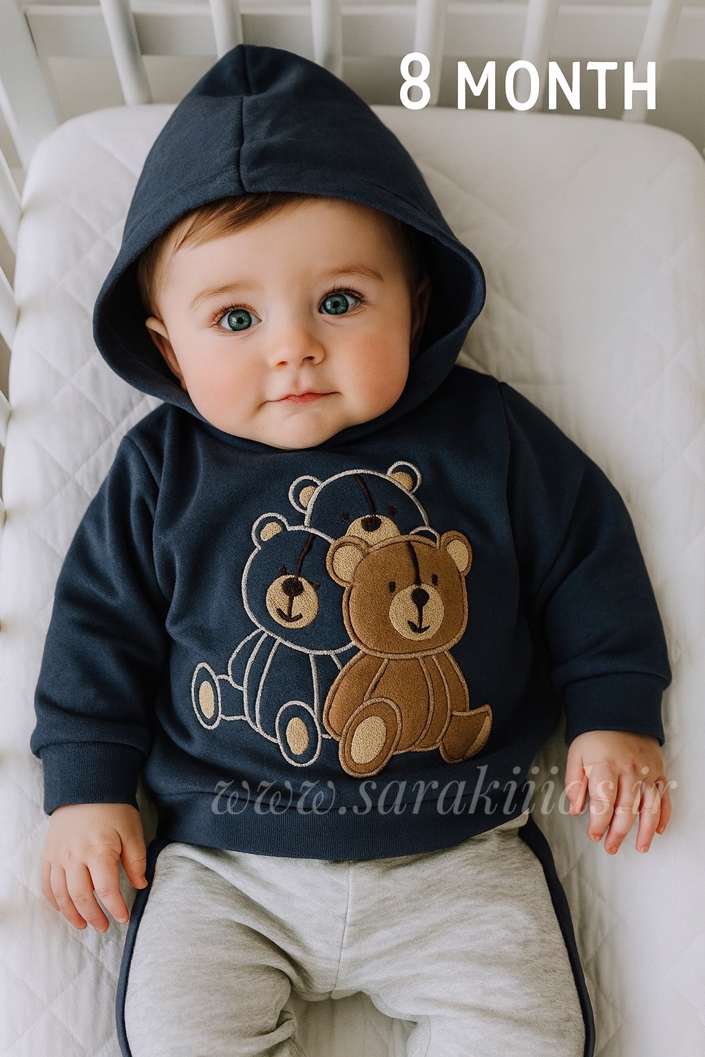 سایز سه (حدود ۸ تا ۱۲ ماه) : قد هودی ۳۶، عرض هودی ۲۸، قد شلوار ۴۴